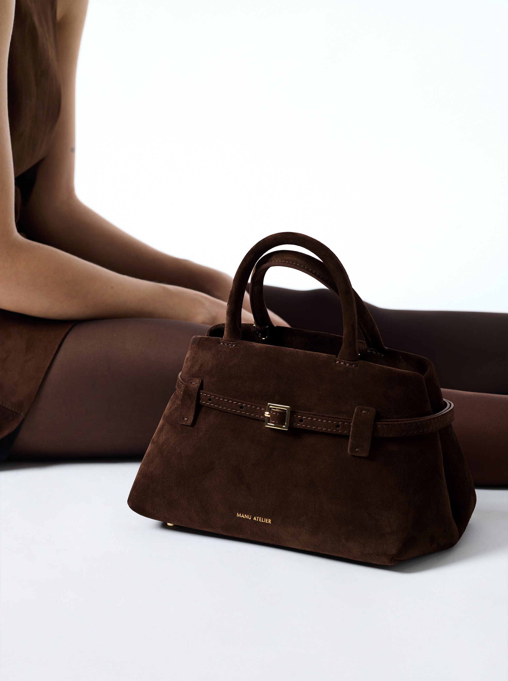 Le Cambon 25 Deep Brown Suede by Manu Atelier is an invitation to embrace texture with style. Soft deep brown suede forms the foundation of this timeless silhouette, featuring top handles, an adjustable strap, and a beige-lined interior with zipped pocket.