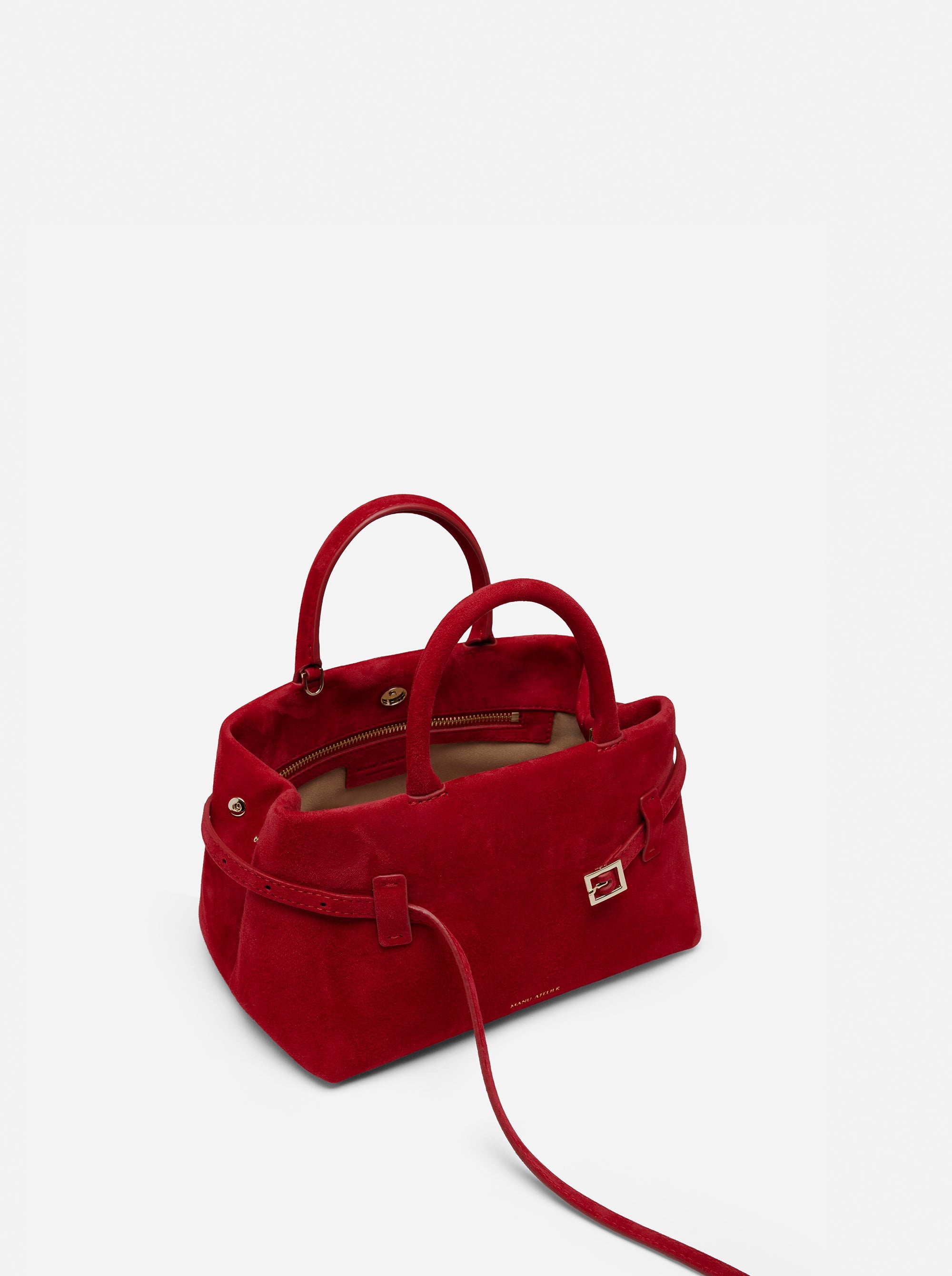 Stand out in style with the Manu Atelier Le Cambon 25 Red Suede. This striking piece showcases vivid red suede, a structured minimalist silhouette, and intuitive top handles. The adjustable strap, beige lining, and practical zipped pocket make it functional for everyday luxury, blending iconic craftsmanship with bold elegance.