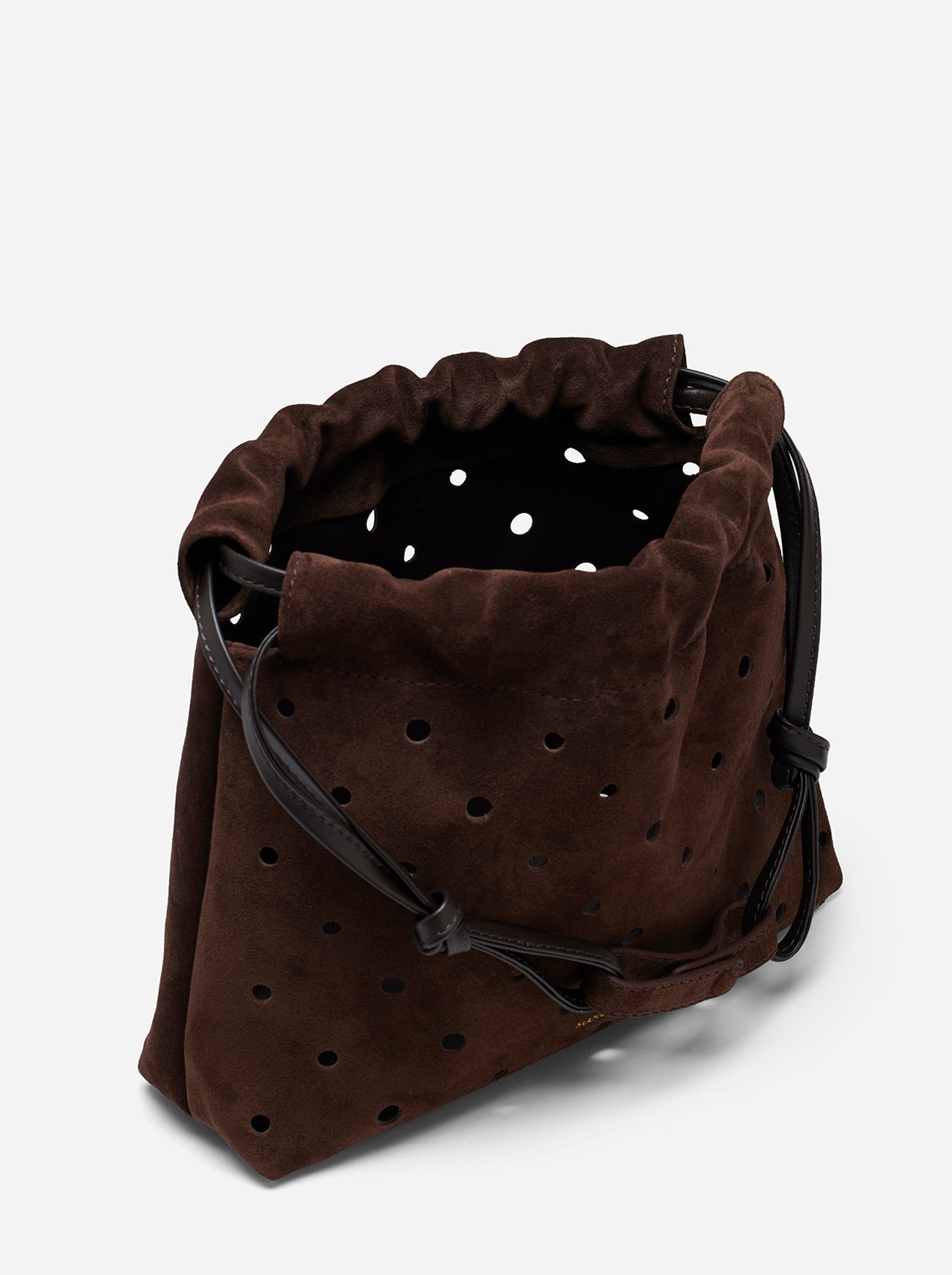 Softly structured yet playfully undone, the Romy Pouch introduces Manu Atelier’s modern approach to craftsmanship. Made with a perforated design, a full leather interior, and a suede leather exterior, it highlights the beauty of pure material and meticulous construction. The drawstring design gathers the leather into gentle, sculptural folds, creating a sense of natural movement and effortless refinement. Designed with versatility in mind, its slender, bitter brown calf leather strap can be detached, transforming the Romy into a sleek and effortless clutch.