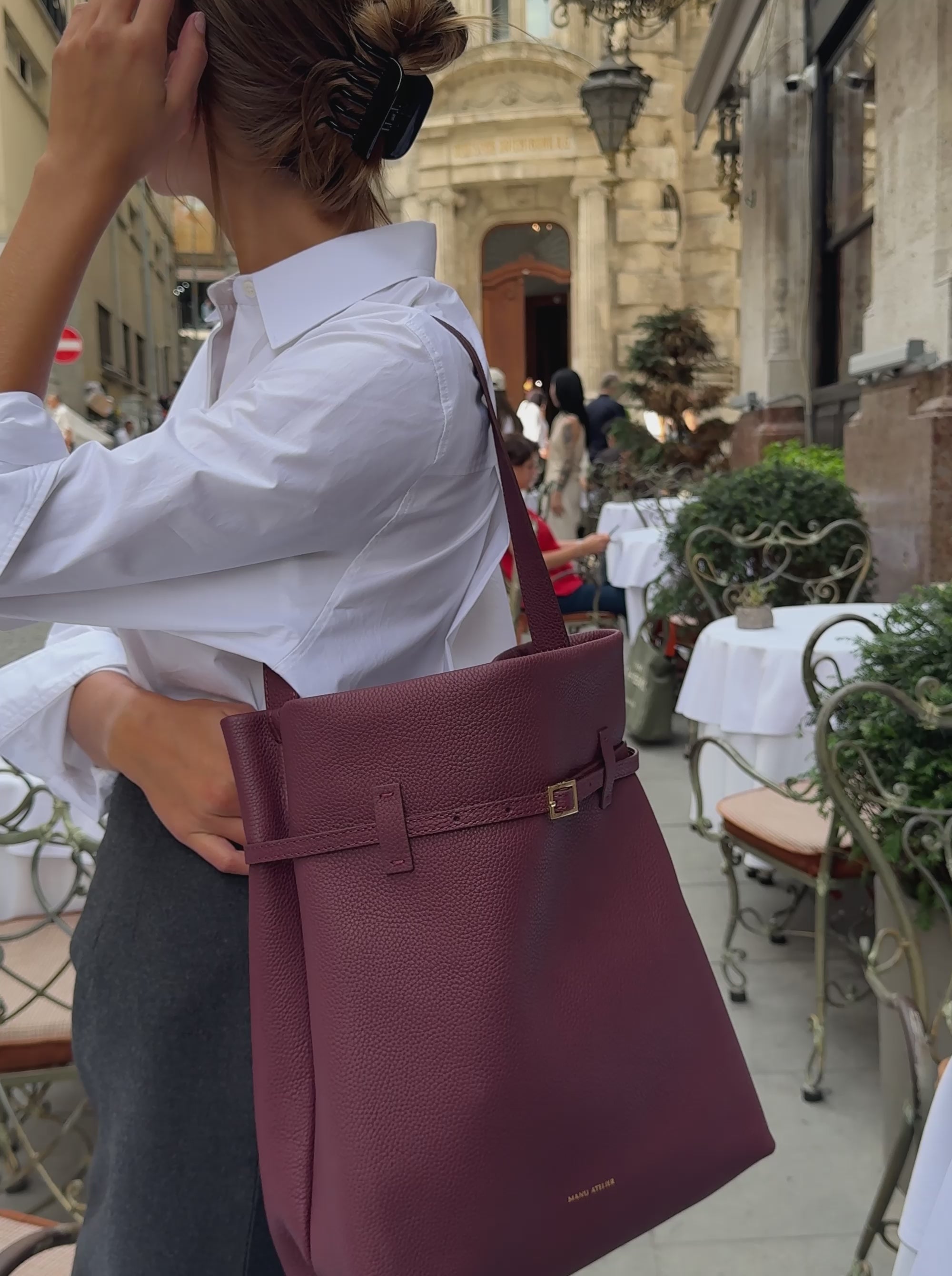 One of our signature pieces, Tote du Jour, places simplicity, craftsmanship, and sleek details at the forefront, underscoring a sense of freedom while keeping in step with the pace of metropolitan life. With its spacious interior which has a zipped pocket and four card slots, the Tote du Jour bag can fit a 13’’ MacBook Pro and all your everyday essentials. The adjustable leather belt with light gold-toned metal buckle adds a touch of sleek distinction. Magnet closure offers an ease of use. The signature light-gold toned “Manu Atelier” logo is embossed on the bottom center of the front panel. It’s a statement piece embodying a combination of functionality and sophistication.